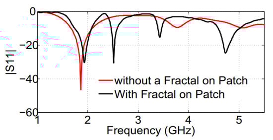However, it is difficult to realize multiband applications from conventional PIFAs antenna. To meet these constraints, several techniques are reported in the literature, notably the use of different feeding techniques by coupling [3], the use of different slots forms [4,5,6,7], and also by the adding of parasitic elements at the antenna radiating patch [8]. Several antenna designs have been based on the use of different fractal shapes to achieve multiband antennas, due to their self-similarity and space-filling properties. The space-filling property of the Peano and Minkowski fractals [9,10] has been exploited to miniaturize the antennas., while the self-similarity property of the Hilbert, Koch, and Sierpinski curves can be used to have multiband behavior [11,12].