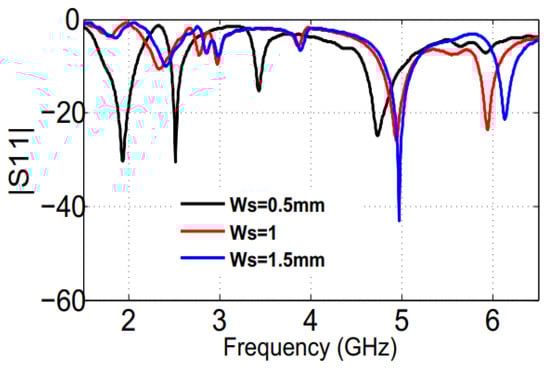 Return loss S11 of the proposed antenna for different widths (Ws) of the fractal slot.