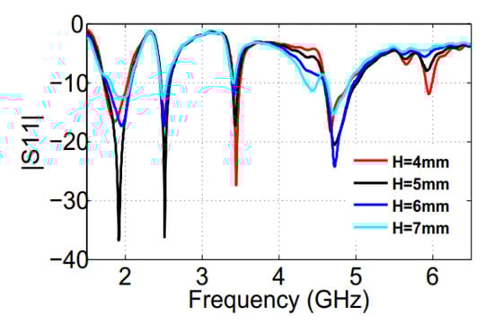 Figure 6 shows variation of the return loss of the proposed antenna with different values of the height H between the radiating patch and the substrate.