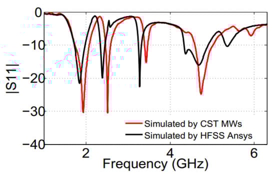 Return loss |S11| of the proposed antenna simulated under CST MWs and HFSS Ansys.