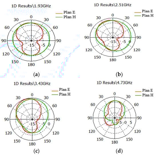 The radiation patterns in 2D (polar) of the proposed antenna on the two planes E and H are plotted at the four resonant frequencies 1.93 GHz, 2.51 GHz, 3.43 GHz, and 4.73 GHz, as shown in Figure 9.