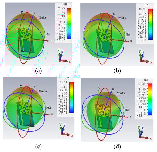 To clearly see the radiation behavior of the designed antenna, we have plotted the 3D radiation patterns at the four chosen resonant frequencies, as shown in Figure 10.