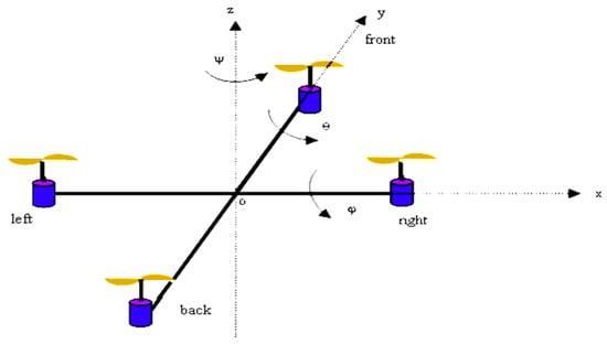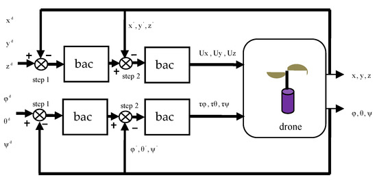 Many control approaches were developed for unmanned aerial vehicles (UAVS) in the literature. Hence, a detailed drone description model is described in [2,3,4]. The sliding mode control strategy based on backstepping control is widely used as it can produce high performances and a faster response for drone systems in general [5,6,7,8,9] and in indoor micro-quadrotors in particular [10]. Modeling- and backstepping-based nonlinear control for a six-DOF quadrotor helicopter is proposed by [11], in addition to the proposition of an adaptive sliding mode control for a quadrotor helicopter in [12].