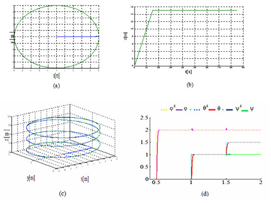 Simulation results. (a) xy drone control. (b) Uniform increase in z height from zero to 15 m. (c) Real and the desired positions exactly meet each other. (d) Orientation angles’ response.