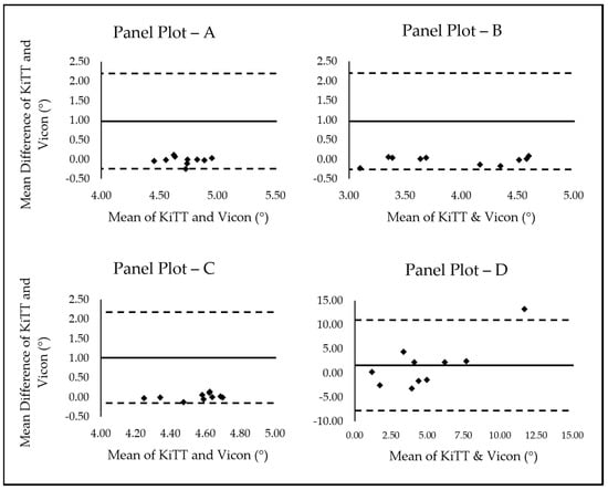 Before creating B&A plots, a test for heteroscedasticity was conducted. A positive result was found with SQ, DL, and LC, but not LE. As a result of this, SQ, DL, and LC raw data were translated into natural logarithmic data for the panel plots. Panel plots A, B, and C display the data points within the 95% Limits of Agreement, establishing validity in the KiTT. Panel plot D displays 90% of the data fitting within the 95% Limits of Agreement, establishing only partial validity with the KiTT for this specific exercise.