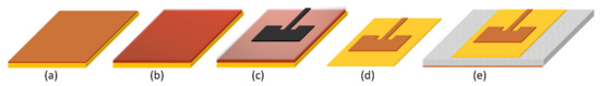 Fabrication process of e-textile mmWave antennas for 5G+ applications based on etched polyimide copper laminates: (a) 25 μm-thick copper-clad Kapton; (b) photoresist deposition; (c) UV exposure through a film mask; (d) antenna traces following etching; (e) antenna traces adhered to fabric.