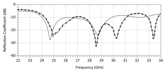 Simulated (no marker) and measured (solid with markers) reflection coefficient (S11) of the antenna, showing an S11 < −10 dB bandwidth from 24.2 to 31.1 GHz.