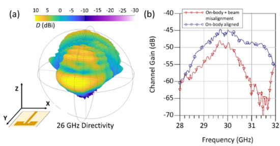 The total efficiency of the antenna, with respect to the reference horn, was found to be around 60% (±5%). The antenna was experimentally characterized through channel gain measurements to show its suitability for on-body mmWave communications. In Figure 4b, it can be seen that over −55 dB forward transmission can be maintained between two symmetric textile antennas along the body with and without main beam alignment. Such a link budget would enable this e-textile antenna to integrate with recently reported, short-range, high-data-rate mmWave transceivers, such as low-power, high-speed backscattering modulators printed on flexible substrates [7].