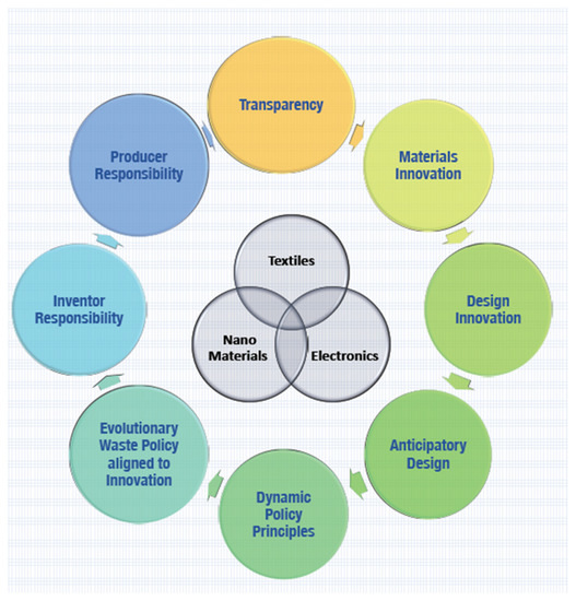 Whilst considering legislation development that encourages innovation in e-textiles, it is worth considering previous debate and research on policy. As far back as 1800, policy makers and theorists such as Bentham [7], and more recently Marciniak [8], advocate preventative legislation, agreeing that repairing damage is worse than adopting anticipatory policy principles. The arguments against preventative legislation are strong, as a potential consequence is loss of individual and societal freedoms. However, there is differentiation and debate between prevention and the so-called ‘precautionary principle’, highlighted by Marciniak, who acknowledges that environmental politics have led to more precautionary directives or regulation. In relation to e-textiles and their development, the waste impact is speculative, but can be based on an understanding of waste habits in related fields such as electronics and textiles. It is safe to say that preventative measures prior to e-textile waste reaching unmanageable levels are advisable and would encourage innovation in disposal and reuse. Within the EU, precautionary principles have been adopted, not without debate on effective implementation. However, retrospectively, this approach may have avoided some previous environmental issues such as asbestosis and dichlorodiphenyltrichloroethane (DDT) [9].