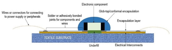 E-textiles combine electronic and textile materials to achieve electronic solutions that are more integrated into human life. Such solutions include health monitoring and rehabilitation [1], aesthetic augmentation [2], and sustainable energy solutions for low power wearable devices [3]. However, the transition of e-textiles from research prototypes to commercial devices significantly hinges on the reliability and robustness of the e-textile in real consumer environments [4]. One such reliability concern centres on achieving durable wired connections between e-textile circuits and their power supplies and/or external peripheral devices. Most of the reliability research on e-textiles has focused on preventing fatigue failures along the embedded conductors under practical stresses. Different methods for improving the durability of conductors that have been reported include the optimization of conductor design with serpentine structures [5], locating the conductors on the neutral axis of the printed e-textile [6], and using mechanically resilient functional materials to enhance the lifetime of the e-textile [7,8]. However, the first point of mechanical failure typically occurs at the bonded joints where electronic components are bonded to the embedded conductors [9] or where the wires connect the e-textiles to external devices and power supplies [6]. For a typical printed e-textile construction, shown in Figure 1, wired connections are unavoidable, hence it is imperative to find solutions that mitigate these failures through robust bonding methods.
