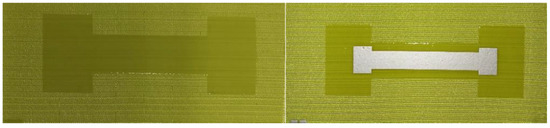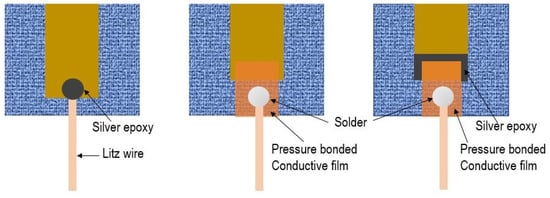 Silver loaded epoxy, conductive copper film, and low-temperature solders were used to attach textile-based Litz wire to the printed conductor based on the three bonding methods shown in Figure 2. The silver epoxy was cured for 10 min at 120 °C while the copper film was pressure-bonded onto the conductor after the Litz wires were soldered. Since the silver-loaded epoxy becomes stiff and rigid when fully cured, the conductive copper film was chosen to increase the flexibility of the bonded joints and minimize the stiffness gradient between the bonding material and the printed conductor.