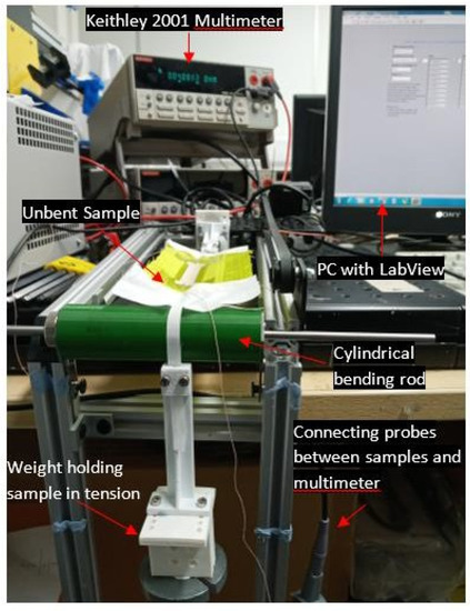 Three samples of each of the bonding methods were subjected to 90° cyclic bending around a 5 mm bending radius under a bending tensile load of 1.5 N as described in [13]. The cyclic bending is driven by a stepper motor. Real-time monitoring and assessment of the performance of these bonded joints under cyclic bending stress was achieved by continuously measuring and recording the electrical resistance of the screen-printed conductor using a LabView controlled Keithley multimeter, as shown in Figure 4. The durability of the samples containing any of the bonding methods was compared with that of samples without any bonding material.