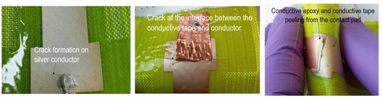 Figure 7 compares the performance of the flexible bonded joints created from electrically conductive film, and the intermediate joints formed by combining conductive epoxy with the conductive film. The results indicate that the flexible joints quickly degraded under cyclic stress as shown in Figure 7a and introduced sudden peaks and fluctuations to the measurement within the first 1000 bending cycles due to intermittent contact. The magnitude of this generated noise reduced with the intermediate joints, which used the conductive epoxy to increase the bonding strength of the conductive film as shown in Figure 7b. This result was expected since the epoxy-based bonded joint showed more resilience under bending. In all the tested samples, the failure point always occurred at the interface between the bonding material and the printed conductor, as shown in Figure 5. The crack length propagated through the printed conductor when the sample was repeatedly loaded with bending stress.