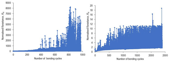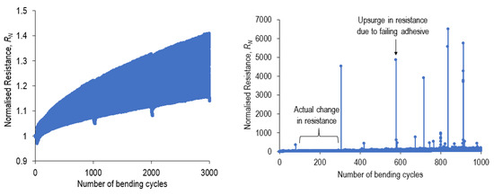 The result showed that the presence of the bonded joints generally induced more stress on the silver conductors during bending and generated the fractures shown in Figure 5. Whilst samples without the bonded joints survived more than 10,000 cycles before crack formation, samples with bonded joints only survived 3500 cycles, after which the electrical resistance of the samples could not be measured by the Keithley multimeter. These fractures introduced poor contact between the contact pad of the conductor and the bonding materials. The poor contact triggered high contact resistance between the wire and the silver conductor and introduced noise into the electrical resistance measurement of the printed conductor, as shown in Figure 6. Figure 6a shows the actual change in the normalised electrical resistance (i.e., the ratio of the electrical resistance in bending to the measured resistance before bending) of the printed conductor over 3000 bending cycles before any noticeable failure at the bonded joint of the conductive epoxy was detected. As soon as the bonded joint began to fail, an upsurge of almost 1000 was initially noticed in the normalised resistance. This eventually deteriorated with an increase in the normalized resistance of up to 7000 within 1000 bending cycles, as shown in Figure 6b.