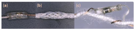Electronic yarns (E-yarns) are a type of E-textile where small electronic components are embedded into the core of the yarns that make up the garment. The technology integrates the electronics by soldering the components onto copper wires. The functional part is then encapsulated within a rigid resin micro-pod to make it washable and increase the robustness of the solder joints [6]. This core structure (Figure 1a) is then inserted into a knitted or braided structure to provide the appearance of a normal textile yarn (Figure 1b). The process to manufacture E-yarns has been discussed in earlier publications [6,7].