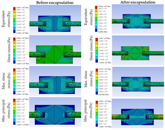 A simplified 3D geometry was designed using Autodesk Inventor (Autodesk, Mill Valley, CA, USA). Models were prepared to simulate a 0.5 × 0.5 × 1.0 mm component that was soldered onto a copper wire with a diameter of 0.15 mm. A second model represented the same soldered component encapsulated in a resin micro-pod. The 3D models were then used for finite-element static analysis using ‘Ansys workbench 2021R1’ (Ansys, Inc., Canonsburg, PA, USA). A static analysis was conducted to analyze the stress distribution in the single-lap joint of the electronic component soldered onto the copper wires. The analysis calculated the overall stresses at each element based on the von-mises criterion, shear stresses in the XZ (the plane parallel to the axis of the copper wire) direction, the highest stress in one of the principal directions at each element, and the highest shear stress at each element by plotting Mohr’s circles at each element, using the principal stresses.
