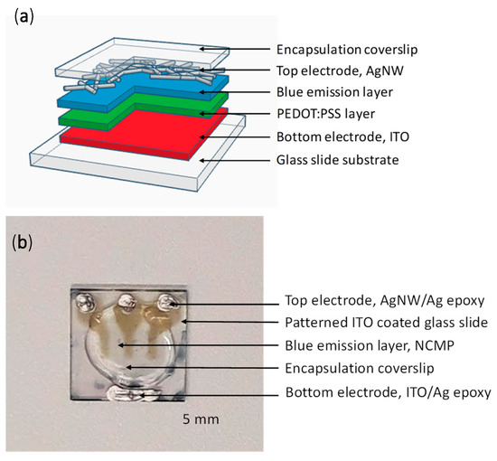 (a) Shows a pictorial schematic of the solution processed device architecture. (b) Image of the fabricated blue-emitting device.
