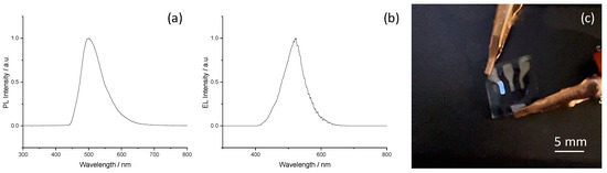 (a) Photoluminescent (PL) intensity spectrum obtained by laser excitation on the Merck NCMP in cyclohexanone solution, (b) electroluminescent (EL) intensity spectrum obtained by electrical bias at 6 V on the NCMP OLEC (spectrometer integration time of 500 µs), (c) the NCMP Merck blue-emitting device (reference device) lit up during measurement with a brilliant blue.