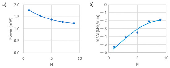 Different coils were knitted in a 1/1 rib stitch using cotton yarn with a different number of rows that include the metal wire. The number of knitted rows with the wire is equivalent to the number of windings (turns) in a coil. All coils had the same diameter. Increasing the number of turns, N increases the self-inductance of the coil but also increases its resistance. The oscillation frequency decreases with the increasing number of turns. This translates into a decrease in power consumption with the increasing N. Figure 5a gives the power consumed by the oscillator and counter during the time it is on but ignores the power consumed by the microprocessor that remains the same for all implementations. Figure 5b gives the sensitivity: Δf/Δl with l circumference. This demonstrates a trade-off between power and sensitivity. This trade-off is a consequence of converting inductance to frequency that causes a decrease in sensitivity for an increase in rest inductance value. For the given coil implementation, a compromise would be to use N = 5, that has a higher power consumption but also higher sensitivity.