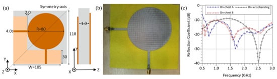 The proposed e-textile sensing antenna: (a) layout and dimensions (in mm); (b) photograph of the fabricated prototype; (c) measured reflection coefficient of the antenna on different body parts showing a matched impedance.
