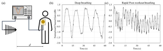 Antenna gain measurements showing the breathing patterns: (a) measurement setup; (b) measured channel gain during deep breathing; (c) measured channel gain during rapid breathing.