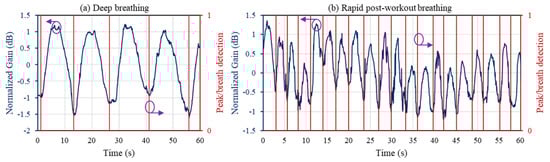 The channel gain was measured over a period of 60 s. Two breathing patterns were measured: slow, deep breathing, and rapid breathing post-activity. Figure 2b,c show the measured channel gain response for both breathing patterns. Each peak observed corresponds to a single breath, where the total number of counted breaths, from the RF sensor, matches the manual breath count. To further demonstrate the suitability of the proposed sensing method for detecting the breathing rate of the user, the measured traces were post-processed using a simple peak detection algorithm. Figure 3 shows the successful breath-rate detection using the peak detection algorithm.