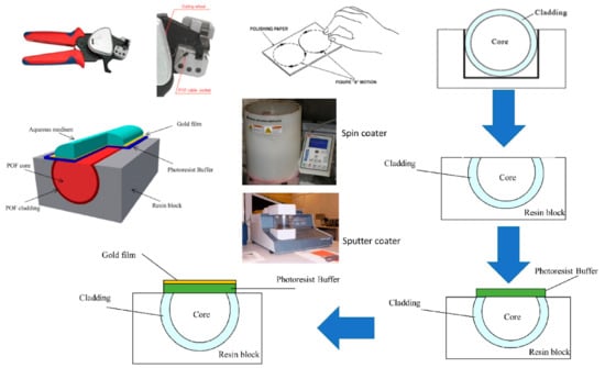 The SPR platform was realized by exploiting a plastic optical fiber (POF) with a core of poly-methylmethacrylate (PMMA) of 980 µm and a cladding of fluorinated polymer of 10 µm (a total diameter of 1 mm), embedded in a resin support and erased as previously described [] to produce a D-shaped region via polishing. The multilayer interface was realized as described for similar sensors. First, a Microposit S1813 photoresist, with a refractive index higher than that of the POF core, was deposited on the exposed POF by spinning at 6000 rpm for 60 s and polymerizing. Then, a gold film 60 nm thick was sputtered on the photoresist layer by a Bal-Tec SCD 500 machine.