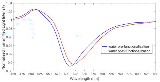 The presence of the receptor layer on the gold surface was demonstrated by the SPR method by comparing the transmission spectrum of the bare platform (SPR-D-POF-bare) in water with that of the MUPA-derivatized platform (SPR-D-POF-MUPA) in water. An example is reported in Figure 2, in which it is seen that the spectrum of SPR-D-POF-MUPA normalized on the spectrum in air is similar to that of the SPR-D-POF-bare normalized on the spectrum in air, but with the resonance wavelength shifted to higher values. This clearly indicates the presence of some receptor molecules at the gold surface producing a refractive index higher than that of pure water.