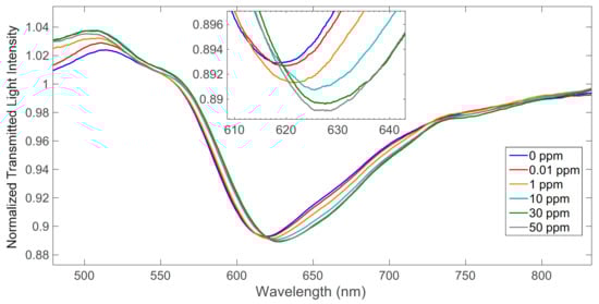The spectra of SPR-D-POF-MUPA in 0.1 M NaNO3 solution containing different concentrations of uranium(VI), normalized on the corresponding spectra in air, are reported in Figure 3. As shown in Figure 3, when the analyte concentration increases, the resonance wavelength increases and shifts to the right; in fact, the refractive index in contact with the gold nanofilm increases with the uranium concentration.