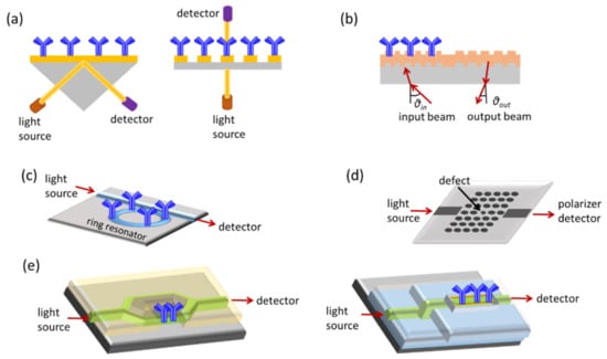 Schematic presentation of label-free optical sensing methods: (a) SPR, (b) grating couplers, (c) ring resonators, (d) photonic crystals, and (e) interferometers.