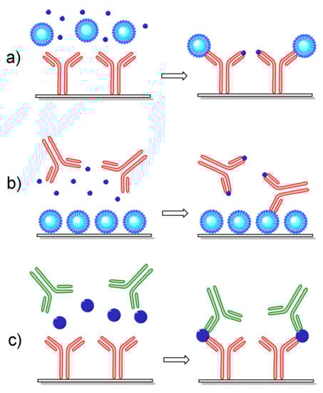 The non-competitive or sandwich immunoassay format is usually followed when the antigen has at least two antigenic determinants or epitopes in its molecule since it requires the combination of two antibodies that do not compete with each other for binding to the antigen. Thus, to perform a non-competitive immunoassay (Figure 2c), one of the antibodies should be immobilized onto the transducer surface (capture antibody) and a second one (detection or reporter antibody) is attached on a different epitope of the surface-bound antigen molecules, forming a “sandwich”. In sensors based on label-free transduction principles, the detection antibody might be non-labeled; however, the use of labeled antibodies is possible even in these cases, aiming at the enhancement of the signal derived by the binding of the detection antibody, and consequently the analytical sensitivity of the assay, i.e., the lowest antigen concentration that can be determined.
