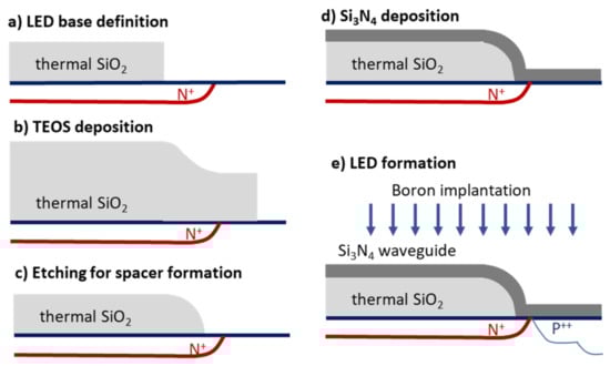 Schematic of the process followed for integrated transducer fabrication: (a) formation of avalanche diode base, (b) silicon dioxide deposition, (c) plasma etching for bending spacer creation (d), deposition of silicon nitride film and waveguide patterning, and (e) boron implantation through the silicon nitride film for self-aligned formation of the LED.