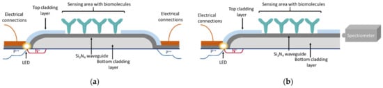 Two configurations of the integrated MZIs have been realized, a fully (Figure 4a) and a semi-integrated one (Figure 4b). The former incorporated on a single chip, along with the integrated LEDs and the MZIs, as a detector, an integrated photodiode and had an LOD in terms of refractive index of 1 × 10−5 RIU. This configuration was applied to monitor binding reactions, including the interaction of immobilized biotin with streptavidin and mouse IgG with an anti-mouse IgG antibody, with LODs of 1 nM and 10 nM for streptavidin and anti-mouse IgG, respectively [37]. Despite the promising analytical results, it was obvious that the fully integrated version suffered from the limitation of phase ambiguity and signal fading of the monochromatic MZIs since the use of a photodetector for signal collection suppressed the information available in the spectrum to a single value. Thus, the semi-integrated version that employed an external spectrophotometer for recording the transmission spectrum was further exploited as an immunosensor [38,39,40,41,42,43,44]. The spectrum recorded contained two characteristic frequencies, one for the TE and one for the TM mode, which could be discriminated through Fourier transform, offering the ability to monitor binding events by monitoring either of them without significant effects on the analytical performance. The analytical sensitivity of the semi-integrated device, with respect to the bulk refractive index, was determined at 5 × 10−6 RIU. For the binding assays of biotinylated bovine serum albumin with streptavidin and anti-mouse IgG with mouse IgG, LODs of 5 pM and 32 pM, respectively, were determined, demonstrating the considerably higher detection sensitivity of the semi-integrated configuration as compared to the fully integrated one [38].