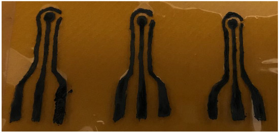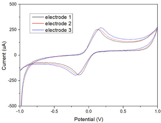 Polyimide (PI), polyethylene terephthalate (PET), cyclic olefin copolymer (COC), and polydimethylsiloxane (PDMS) were tested as substrate materials for the fabrication of the glucose sensor due to their flexibility. Electrodes fabricated on PI sheets showed the best adhesion to the substrate, and this is why PI was chosen for the fabrication of the sensor. A three-electrode system was hand-drawn on the PI substrate using a carbon/graphite ink. To achieve the same pattern each time, a stainless-steel mask was fabricated with the electrode design. The mask was used to carve the design on the PI sheets before drawing the electrodes. The hand-drawn electrodes were reproducibly fabricated with very small performance variation. This was validated by cyclic voltammetry measurements (Figure 1). To increase the sensitivity of the working electrode, carbon black was used as a cost-efficient alternative to other carbon-based nanomaterials, such as carbon nanotubes and graphene oxide, which have been used for the fabrication of electrochemical glucose sensors [27,28,29]. Carbon black exhibits excellent electrical conductivity and offers fast electron kinetics due to its numerous defect sites, thus making it an ideal candidate for the development of low-cost biosensors [26].
