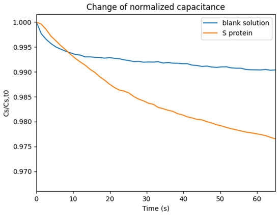 Experiments with S protein were conducted. A 20 μL solution containing S protein (2.5 ng/μL) in Phosphate-Buffered Saline (PBS) was placed on top of the sensor, and the effective capacitance change over time was monitored. A second experiment was conducted, where a 20 μL solution containing only PBS was placed on the sensor in order to calculate the blank solution response. The normalized capacitance change over time is illustrated in Figure 4.