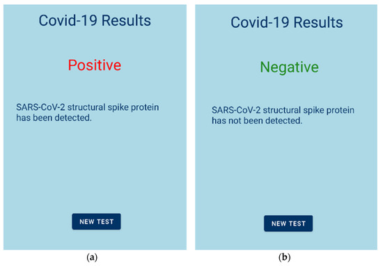 Mobile application results; (a) test positive to S protein; (b) test negative to S protein.