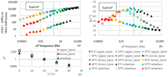 Master curves at 20 °C and shift factors of complex shear moduli of upper and lower layer and complex shear stiffness of the interface ((a), norm; (b), phase angle; (c), shift factors).