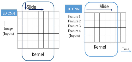 CNN models are typically employed to analyze spatial or multidimensional data. However, one-dimensional CNN (1D CNN) can also be used to analyze texts and time-series data [16]; 1D CNN can extract salient and representative features of time-series data by performing 1D convolution operations using multiple filters [17]. Figure 3 shows the difference between 1D CNN and 2D CNN. The kernel (filter) in 2D moves in both directions while it moves only in one direction for 1D CNN. The input for 2D CNN is an image, while multivariate time series features can be inputs for 1D CNN.