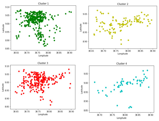 Among different clustering methods, in this work K-Means clustering is selected. Elbow method and silhouette score are used to determine the optimal number of clusters in K-Means clustering and to evaluate the goodness of a clustering technique, respectively. For our data, the optimal number of clusters is selected to be four and the sites are grouped into four clusters, as shown in Figure 5. We note how sites from various geographical areas are grouped into the same cluster because of similarities in their traffic patterns. Moreover, some base stations found in the same locations are grouped into different clusters.