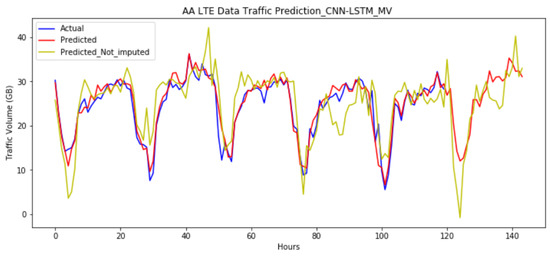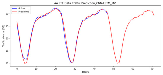 The effect of the input time steps while developing a prediction model is investigated with two input time steps of 24 h and 168 h. Figure 8 and Table 3 illustrate the data traffic prediction for the CNN-LSTM model using 168 h input time steps compared to the actual data traffic, and it captures the data traffic variation well, including for irregular shapes and sharp edges at both ends. However, this modest performance improvement comes at the expense of computational time. The model with 168 input time steps took more time to train the model.