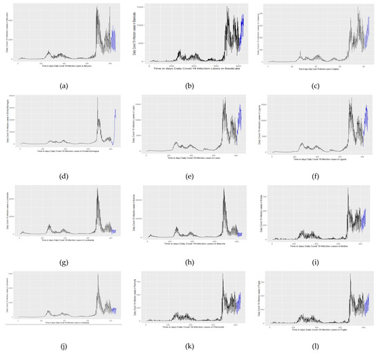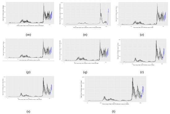 Daily COVID-19 Italian regions’ new cases prediction with ANN model: (a) Abruzzo; (b) Basilicata; (c) Calabria; (d) Emilia-Romagna,(e) Lazio; (f) Liguria; (g) Lombardia; (h) Marche; (i) Molise; (j) Campania; (k) Piemonte; (l) Puglia; (m) Sardegna; (n) Friuli-Venezia Giulia; (o) Sicilia; (p) Toscana; (q)Trentino Alto-Adige; (r) Umbria; (s) Valle D’Aosta; (t) Veneto.