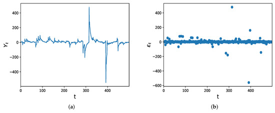 (a) The data plot of exemplary time series of length and (b) the scatter plot of the corresponding innovation terms of the AR(2) model with Cauchy innovations. The chosen parameters of the model are and .