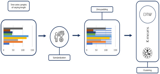 - The Clustering Algorithm. Due to the preprocessing of the data with z-normalization and zero-padding, we opted for the K-means with DTW Barycenter Averaging: algorithm for the clustering. Although according to the state-of-the-art, K-medoids is the most popular technique to be used with DTW, we will see that, in our context, K-means performs better as with the zero-padding, samples become of equal length. DBA, which stands for DTW barycenter averaging [14], evaluates the mean of a set of sequences by iteratively refining the potential average sequence to reach the minimum DTW distance between it and the sequences.