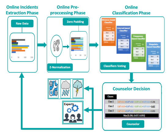 Figure 3, we depict the three main components of our online detection and prediction phase. It is composed of: (1) the online incidents extraction, (2) the online preprocessing phase, and finally (3) the online classification phase. First, it is important to mention that the intended result is to reduce the errors and not eliminate all errors. As our data are significant and challenging, removing all errors is impossible.