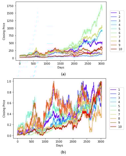 This dataset was originally described in [8]; however, our query retrieved a different number of samples as in [8]. We assume it must have changed since it was originally retrieved. We collected the time series on 20 January 2022, using Yahoo! Finance’s API [11] for the time frame between 12 July 2005, and 3 November 2017, see Table 1. Most time series had 3035 samples, and some time series had 3032 samples; therefore, we stored each time series’s last 3032 samples. Figure 2 presents the time series of BANKEX without and with normalization.