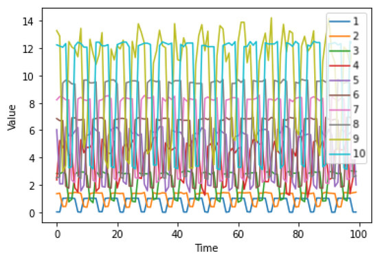The Activities dataset is a synthetic dataset created resembling weekly activities with five days of high activity and two days of low activity. The dataset has ten time series with 3584 samples per series. Initially, a pattern of five ones followed by two zeros was repeated to obtain a length of 3584 samples. The series was added a slope of . The original series was circularly rotated for the remaining series in the dataset, to which noise was added, and each sequence was arbitrarily scaled, so that the peak-to-peak amplitude of each series was different, see Figure 3.