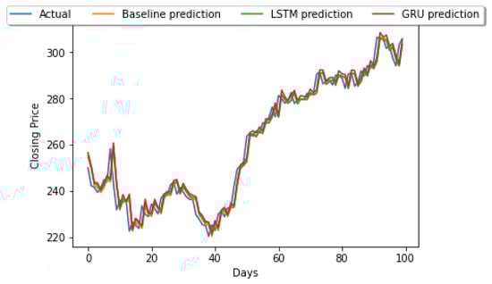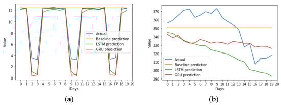 On the BANKEX dataset, two-tailed Mann–Whitney tests show that for 1-step ahead forecasts there is no difference among approaches considering (LSTM & Baseline: . GRU & Baseline: . LSTM & GRU: ). Similar results are found for 20-step ahead forecasts (LSTM & Baseline: . GRU & Baseline: . LSTM & GRU: ). results are consistent with those obtained for . Figure 4a,b show examples of 20-step ahead forecasts and Figure 5 presents an example of 1-step ahead forecasts. Visual inspection helps understand the results.