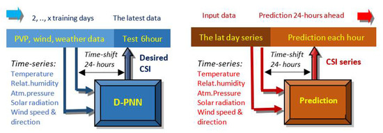 Model development, testing and CSI final output computing (red, right) related to changing PVP day patterns in the fixed 24 h input–output time delay (blue, left).