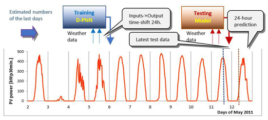 AI regression was used in training the 24 h delay between input–output data patterns (blue, left), selected in the optimal day-range sequences, by the initial assessment model. The statistic models were developed in multisite data processing to apply the last known observation input series to forecast the complete day light cycle of PV power production in the applied 24 h trained prediction horizon (red, right). PVP production in the next 24 h is calculated by processing series at the related times in sequence data in the previous day. Initial assessment models examine data intervals, gradually increasing their days, to pre-define the optimal training process. Their computed output is compared one by one with the time-related data of the target CSI in the reserved part, to obtain the best accuracy. Error minima determine the approximate number of applicable day records that can be used in training. The recognized day-data patterns show mostly a degree of similarity compared to the latest observational hours used in the final testing. This procedure can successfully obtain up-to-date models that can process the unknown last-day input series (Figure 1) in most day-experiment instances.