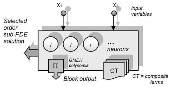 D-PNN forms progressive binary-tree structures, using composite processing functions (7) in PNN nodes, by extending/modifying the last added/processed layer with selected blocks nodes, one by one. Node blocks in secondary subsequent tree layers can form composite term (CT) products, in addition to one-fraction neurons (8). CTs are products consisting of adjustable neurons, i.e., sub-PDE converts, selected in the back-attached production blocks in the backward linked tree structure layers (Figure 4). CTs represent composite sub-PDE solutions for the node-unavailable uk function series in the form of a product that includes images of external and internal functions commonly expressed by the derivation rules (11).